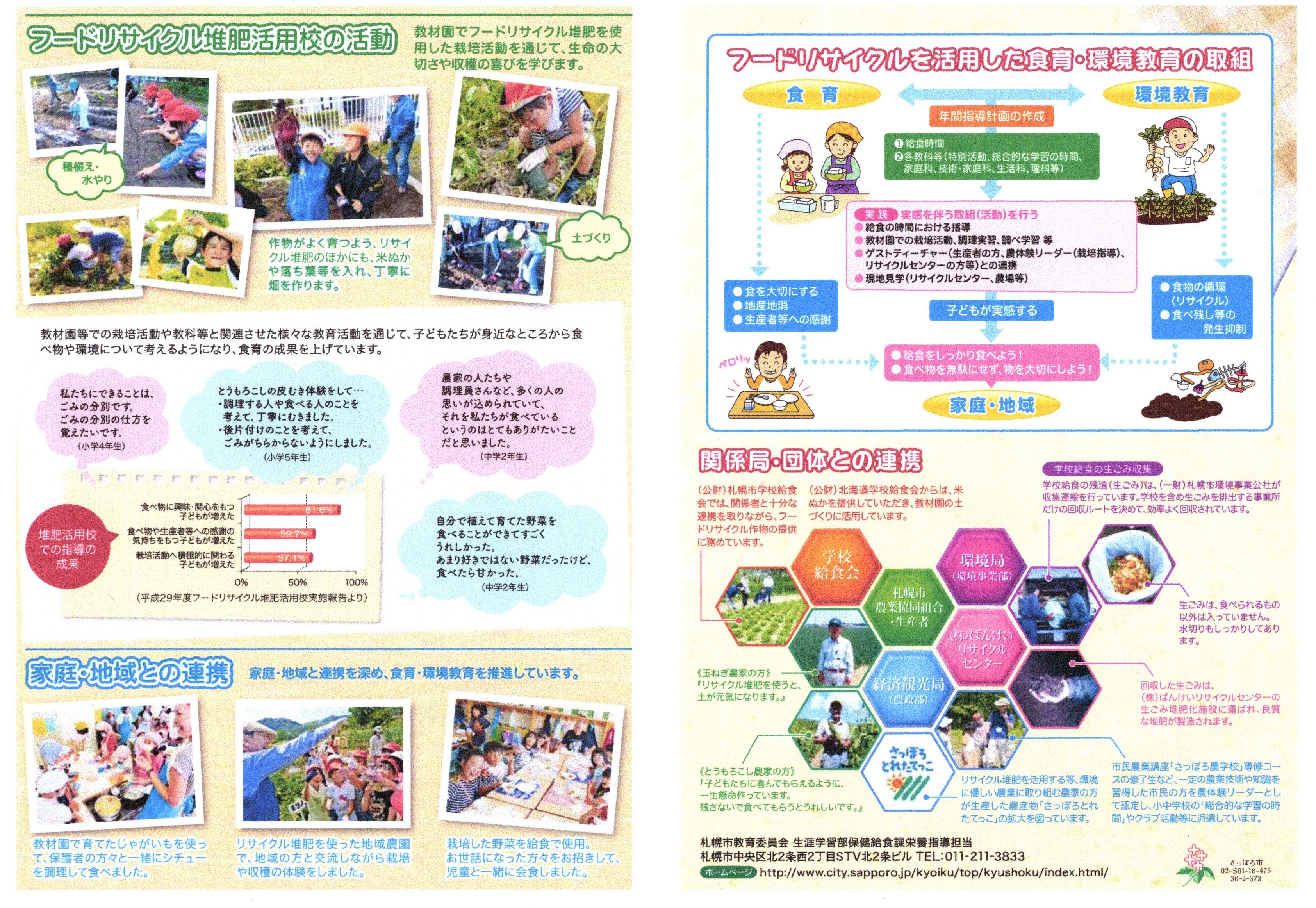 札幌市では従来からゴミの分別、資源化の促進に取組んでいますが、その一環として学校給食を作る過程で発生する調理くずや残食などの生ごみを堆肥化し、その堆肥を利用して作物を栽培し、その作物を学校給食の食材に用いて子どもたちが食するという食物の循環「さっぽろ学校給食フードリサイクル」に平成18年度から取組んでいます。
