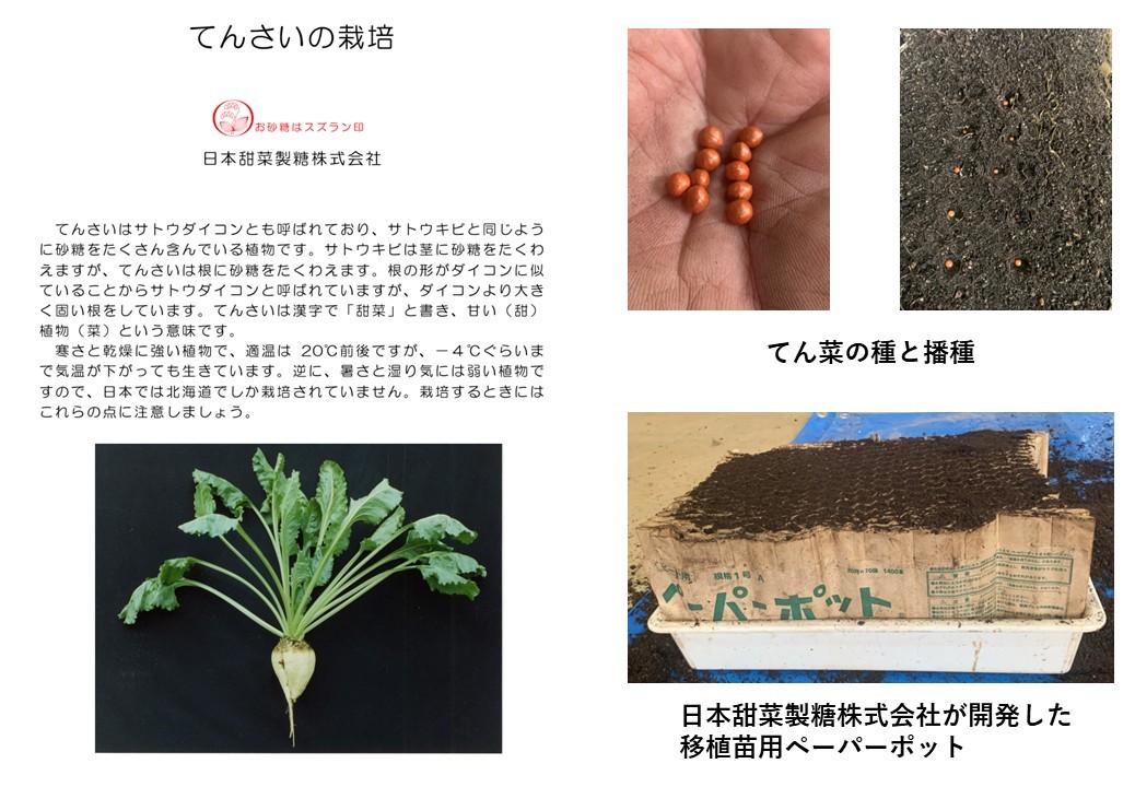 取組むことは、①ペーパーポット(日本甜菜製糖株式会社:開発)とポットで、てん菜の苗を作ります。②学校農園に作った苗を植え、他に直播(ちょくはん)種を直接ほ場に播きます。③みんなでてん菜をお世話します。④収獲、そして砂糖をつくります。⑤つくった砂糖で札幌南区川沿のケーキ屋さんブリスブリスのオーナーパティシエ中本さんと一緒に洋菓子づくりを行います。