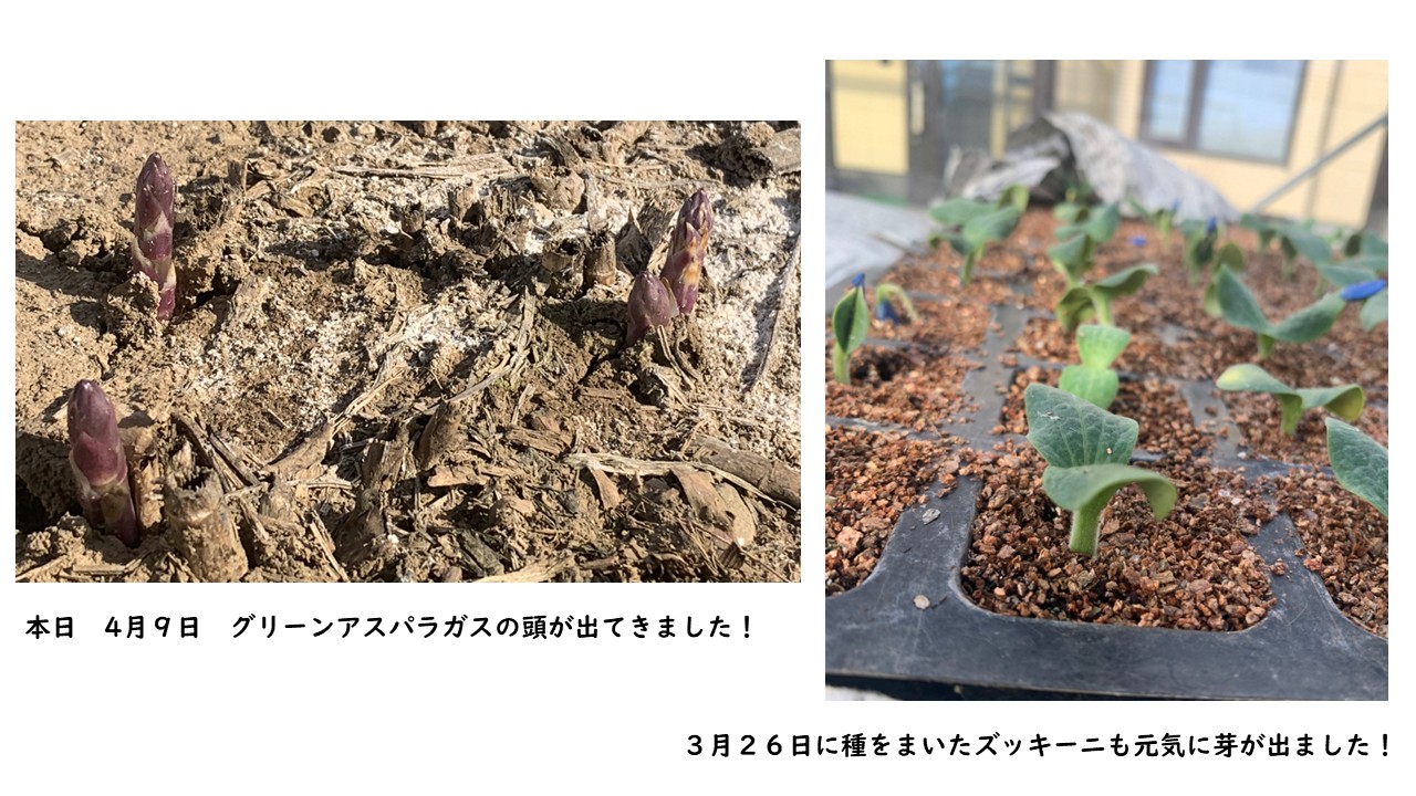 また、3月26日に種まきをしたズッキーニが温室の中で、芽が出始めました。