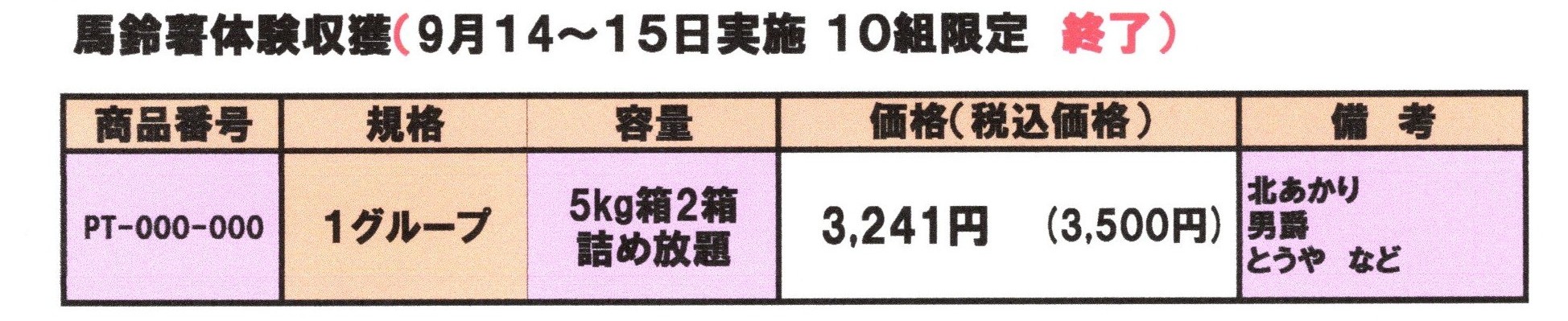 「じゃがいも収穫体験」 10組になりました ありがとうございます 終了 じゃがいも収獲体験は10組に到達しました。 ありがとうございます。 受付終了いたします。 Page Bottom Page Top