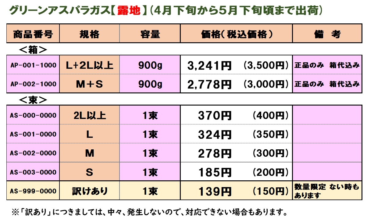 「グリーンアスパラガス(露地)」 2026年4月4日 4月下旬から6月上・中旬まで出荷(注文開始:4月4日から) 送料区分: 60サイズ料金=1箱 2箱(荷合わせ) チルド 80サイズ料金=3箱(荷合わせ)、4箱(荷合わせ)チルド Page Bottom Page Top