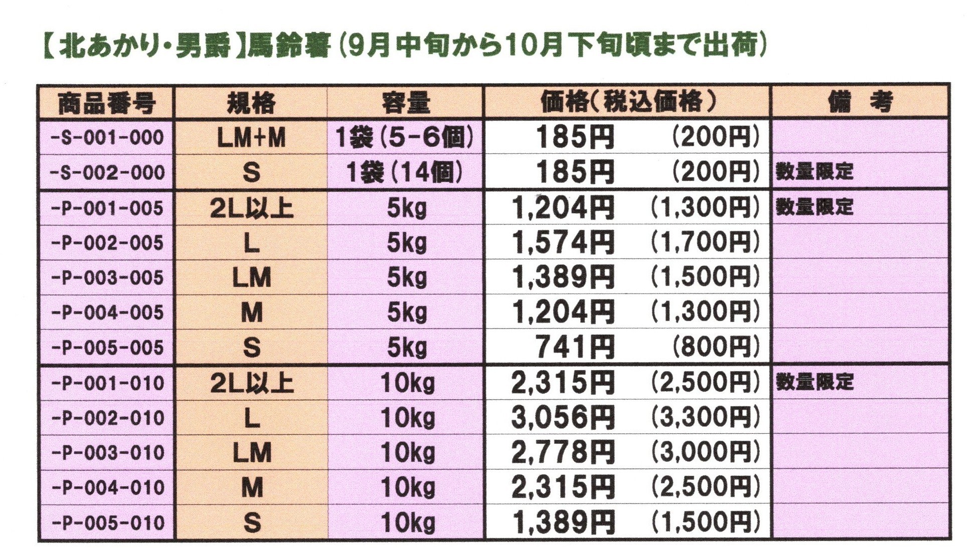 「じゃがいも(北あかり・男爵)」配達日指定不可 9月下旬から10月下旬まで出荷(注文開始:9月20日から) 送料区分:5kg箱 80サイズ料金、10kg箱 100サイズ料金 バラの場合:箱代など別途 Page Bottom Page Top