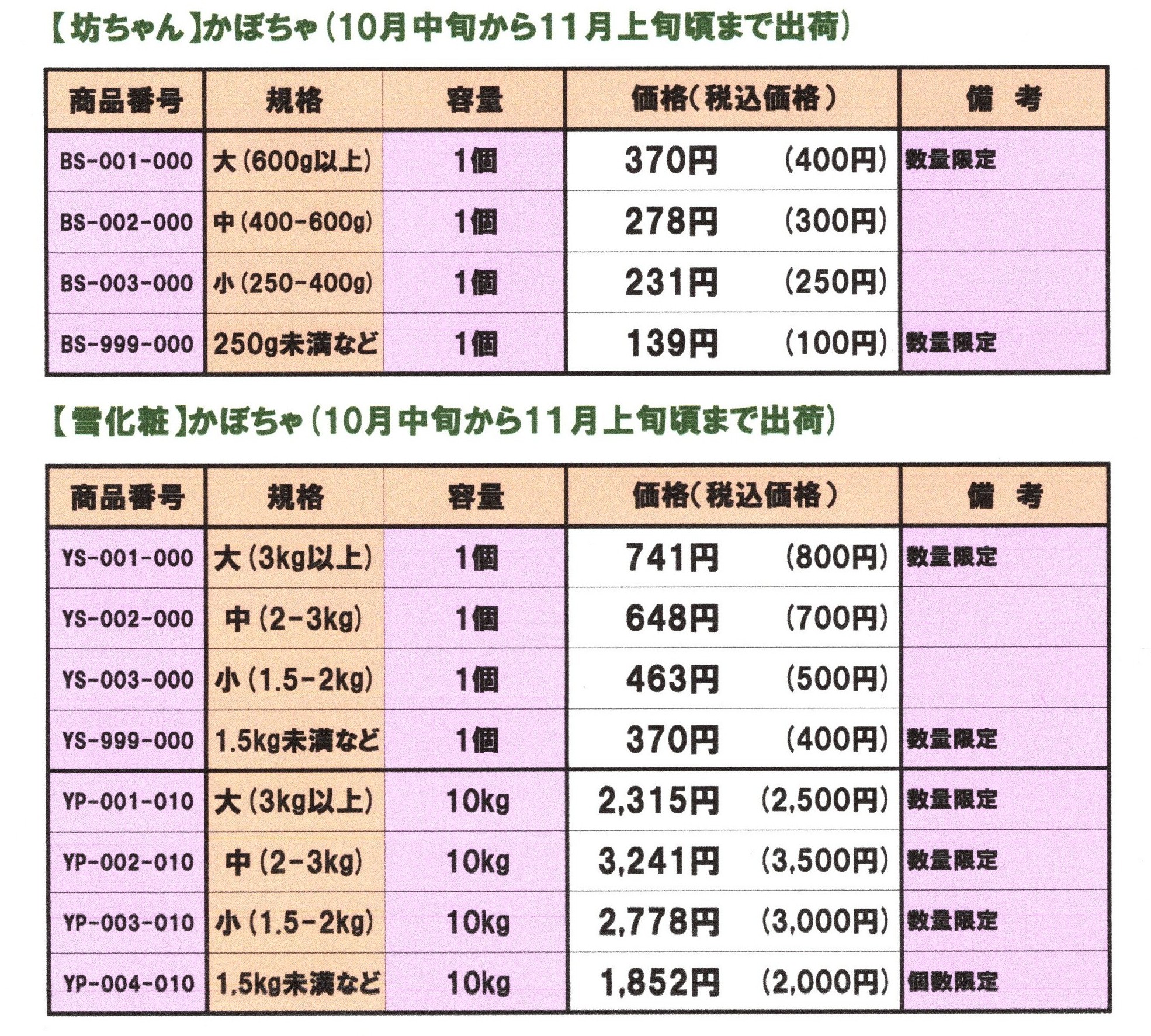 「かぼちゃ(坊ちゃん・雪化粧)」配達日指定不可 9月下旬から10月下旬まで出荷 送料区分:5kg箱 80サイズ、もしくは、100サイズ料金 バラの場合:箱代など別途 Page Bottom Page Top