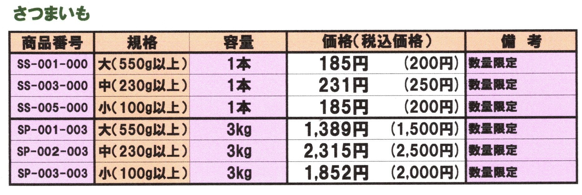 「さつまいも(紅はるか)」配達日指定不可 予定 出荷が決まりましたら、価格も含めお知らせいたします。 10月下旬から12月下旬まで出荷(注文開始:9月下旬から)予定 送料区分:3kg箱 80サイズ料金 バラの場合:箱代など別途 Page Bottom Page Top