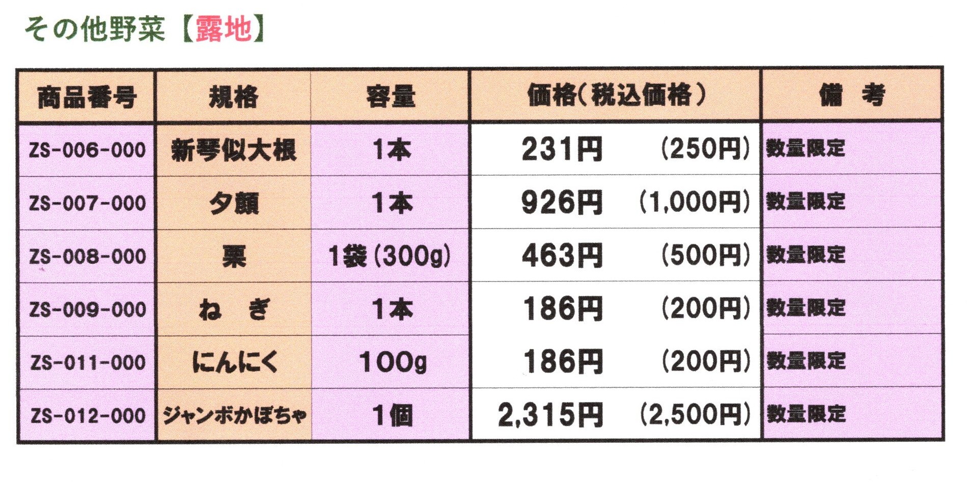 「その他野菜」配達日指定不可 予定 出荷が決まりましたら、価格も含めお知らせいたします。 送料区分:3,5kg箱 80サイズ、10kg箱 100サイズ、チルド可 箱が必要な場合:箱代など別途 Page Bottom Page Top